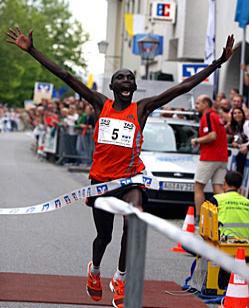 Nicht ganz so schnell wie Sieger Charles Ngolepus (Kenia, 1:01:47, Foto), aber trotzdem flott unterwegs waren die Halbmarathoner der TG Salzachtal am 3. September in Altötting. Manuela Schmid, Franz Baumann und Reiner Schmitt verbesserten ihre persönlichen Bestzeiten um ein gutes Stück.